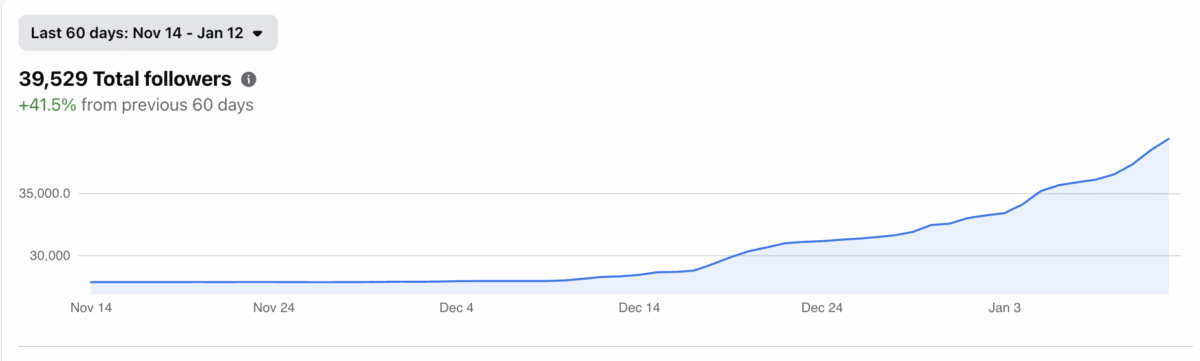 Once I started posting my own graphics and original takes, in early December below, reach increased further and follower growth followed quickly. And, I was accepted into the Facebook Content Monetization program.
