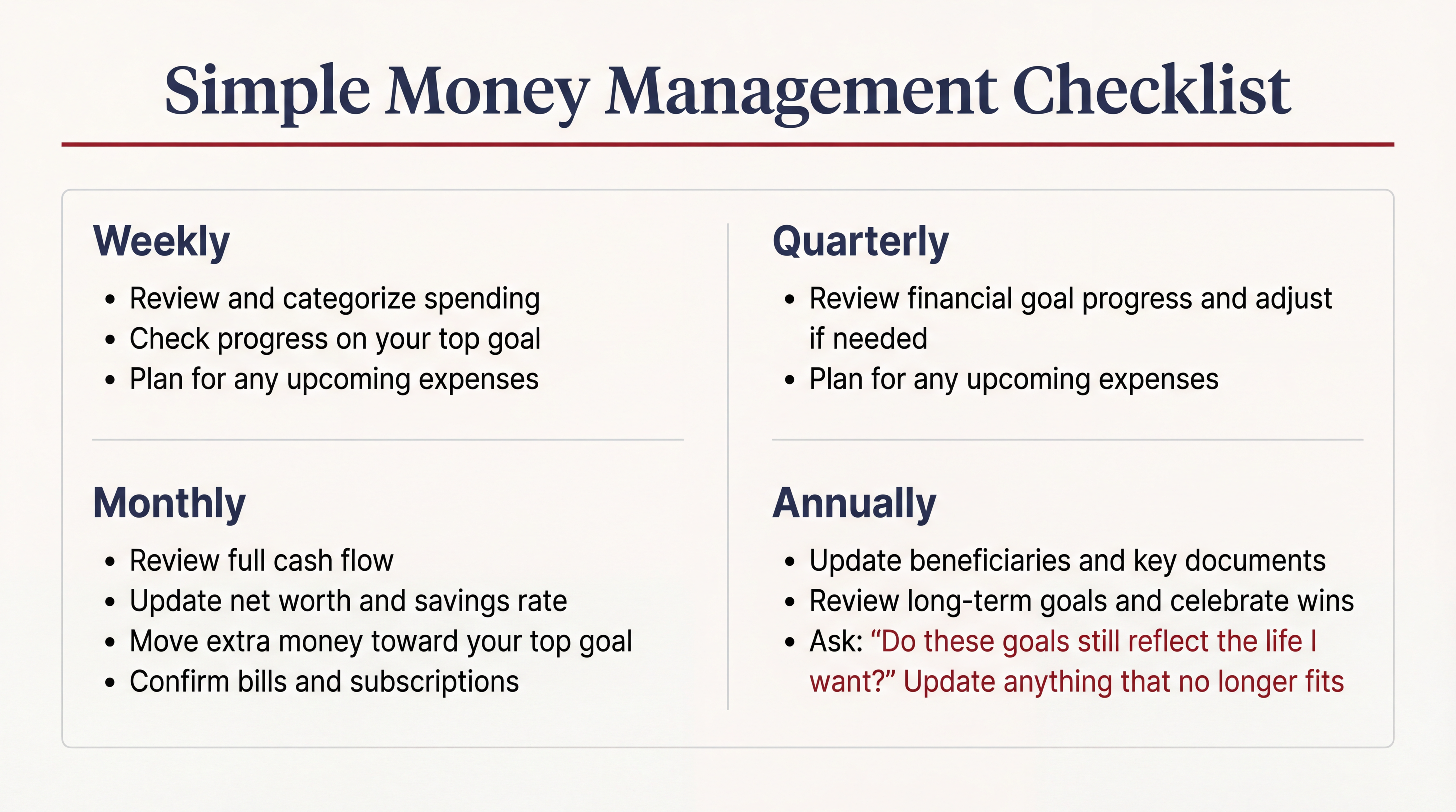 Money management is not something you set up once and forget about. The goal here is to build simple systems that help you stay on course over time.