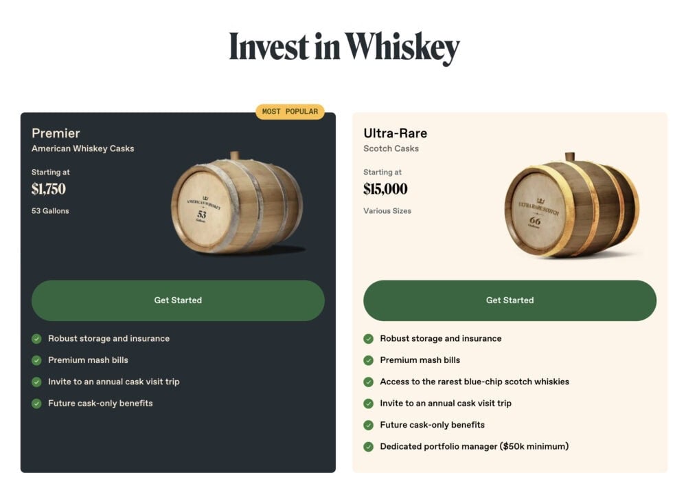 - Ultra-Rare. Top tier offering with rare Scotch whisky casks beginning around $15,000. Includes a dedicated portfolio manager once your investment hits $50,000.